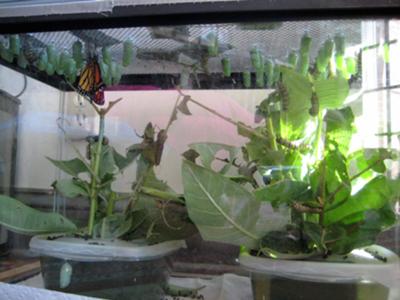 Monarch cats eating milkweed in a terrarium. Milkweed is in green oasis foam in plastic tubs. Chrysalis's hanging from top of terrarium.